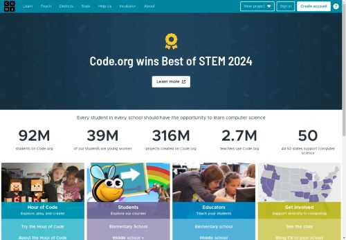 ويشجع موقع كود دوت اورج code.org الالكتروني الطلبة على تعلم علوم الكمبيوتر مجانية من مرحلة رياض الأطفال وحتى المرحلة الثانوية